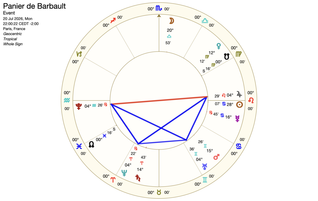 Le ciel de l’été 2026 se distingue par une configuration astrologique rare, impliquant l’ensemble des planètes lentes évoquées jusqu’ici. Celles-ci se trouvent reliées par une série d’aspects harmonieux formant une figure appelée « panier » ou « corbeille », décrite et théorisée par l’astrologue André Barbault.