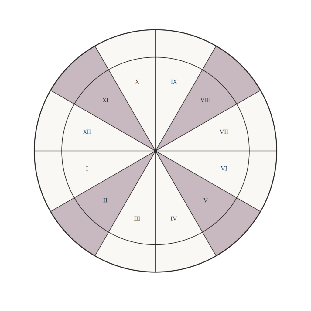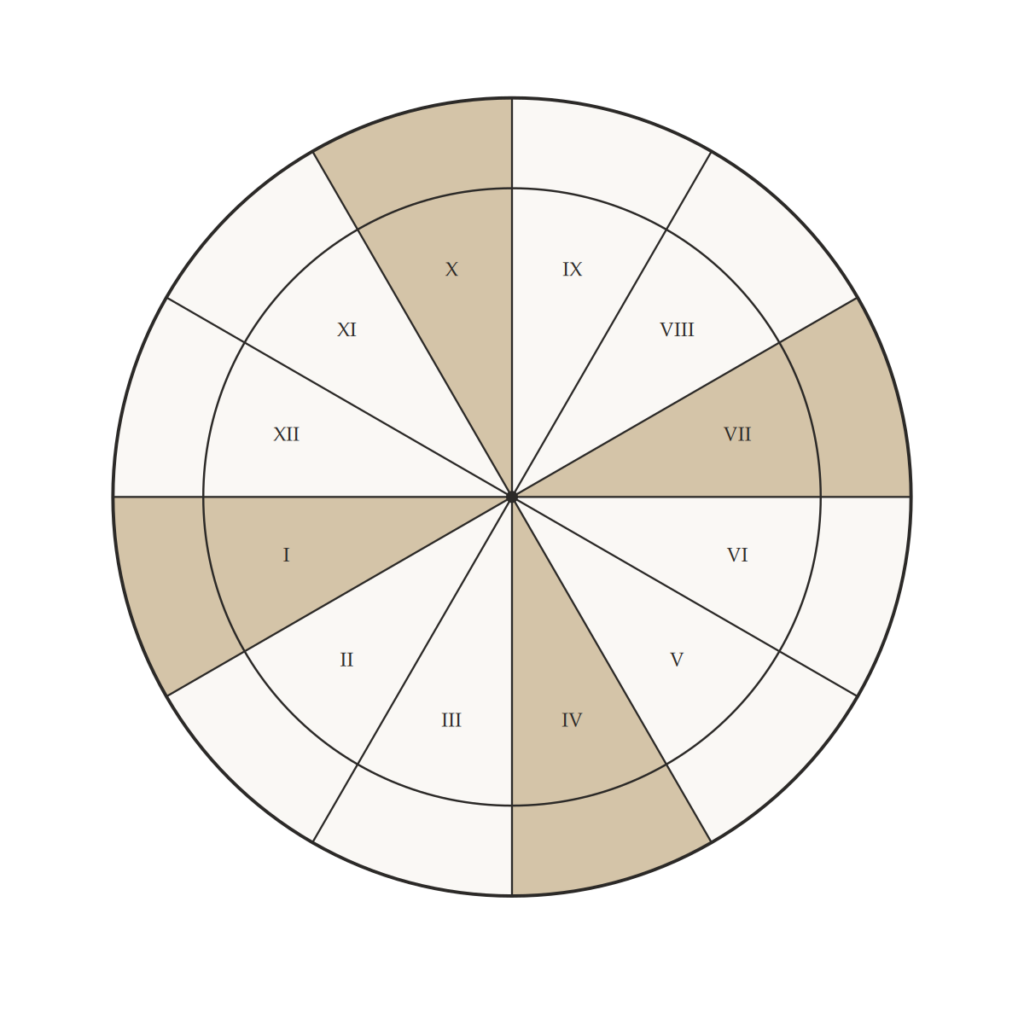 Les 12 maisons sont divisées en trois groupes de quatre, selon leur distance depuis l’Ascendant. Dans le système des signes entiers, chaque signe correspond à une maison complète. Avec un Ascendant Cancer par exemple, la maison 4 sera toujours en Balance, la maison 7 en Capricorne et la maison 10 en Bélier. Mais avec ce système de domification, le Milieu de Ciel et le Fond de Ciel ne se situent pas nécessairement dans la maison 10 et la maison 4 respectivement.