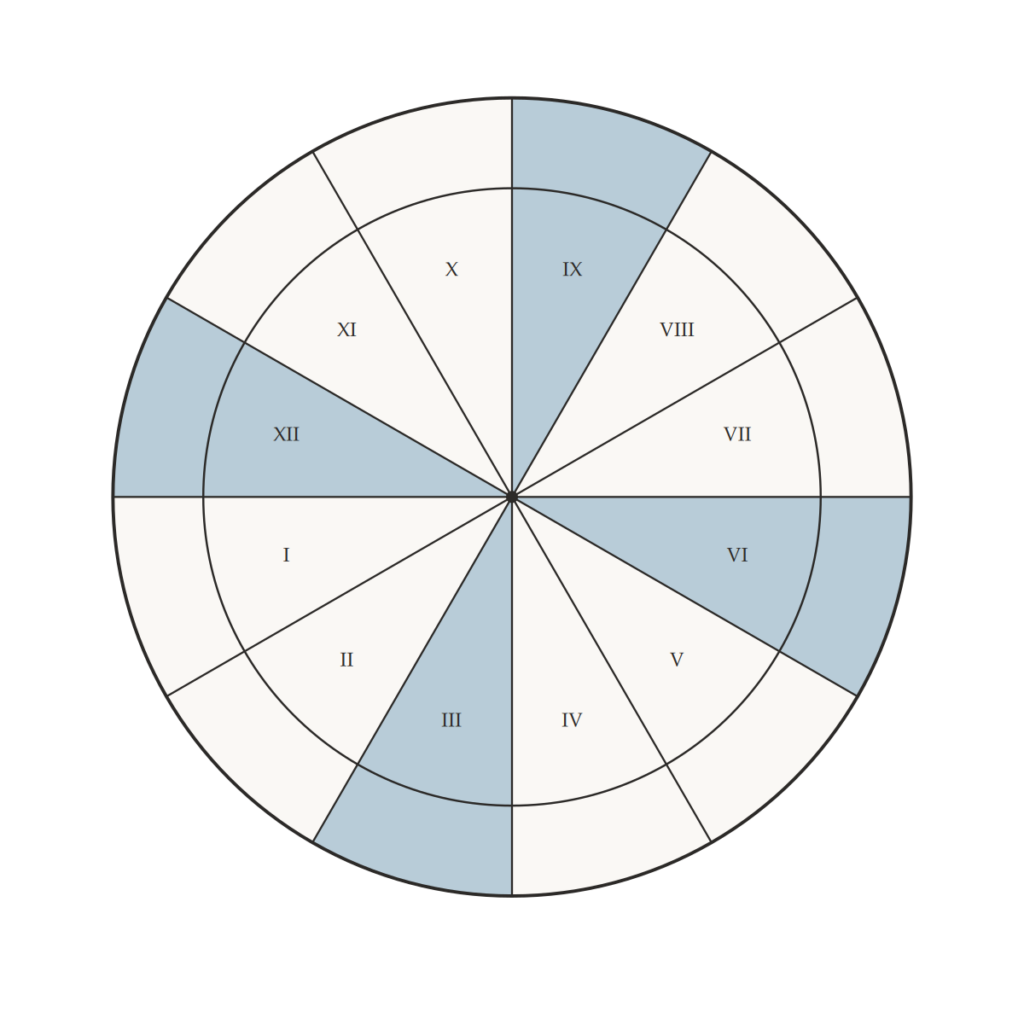 Ces quatre points créent quatre quadrants que les astrologues subdivisent en trois sections chacun, produisant ainsi les 12 maisons. C’est pourquoi les maisons dépendent de trois éléments indissociables : la date, l’heure précise et le lieu de naissance.