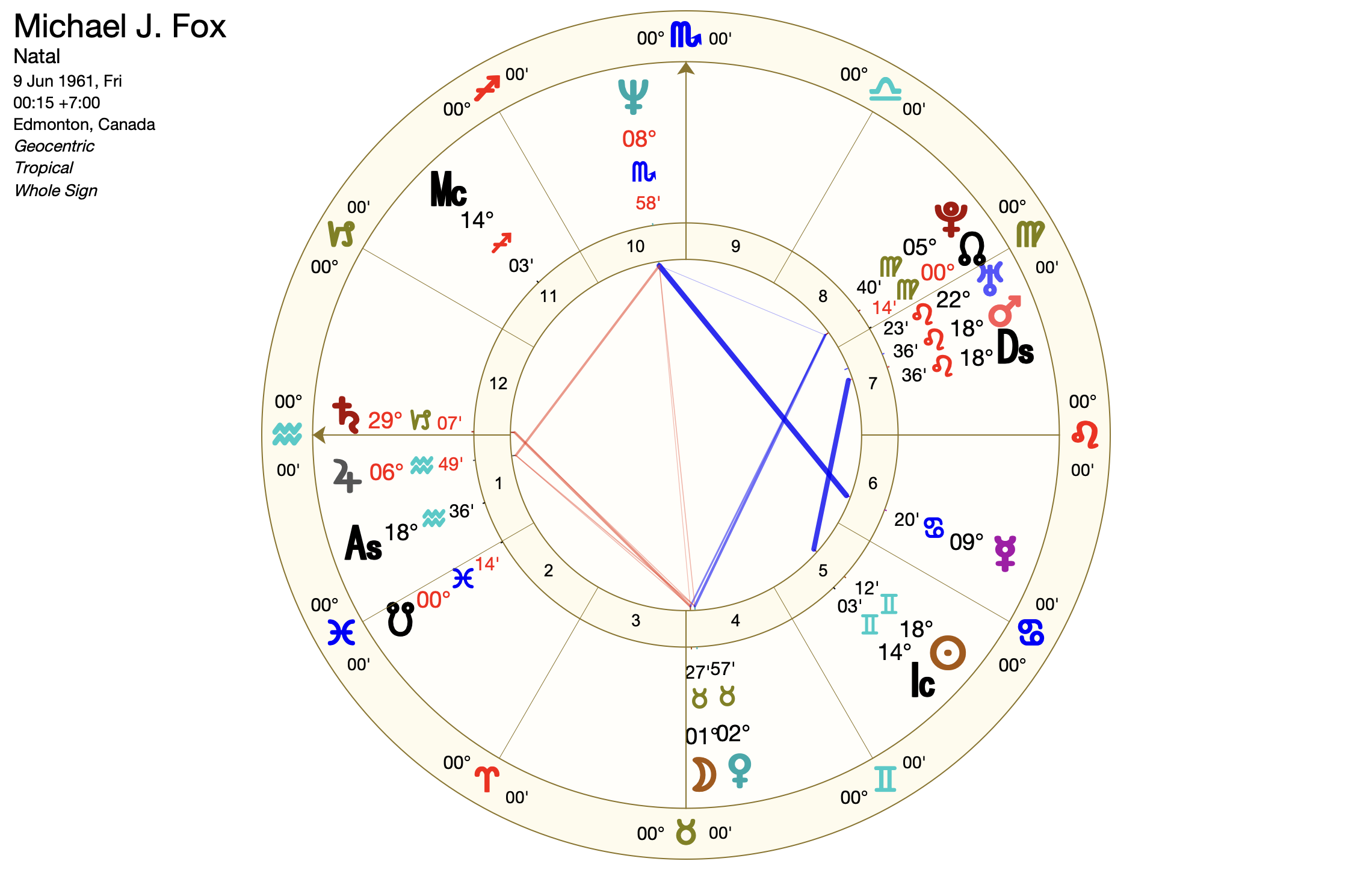 Mickael J. Fox est né à 00h15. Son Soleil est situé en maison 5 : il a donc un thème nocturne. Cela signifie que la Lune, Vénus et Mars sont en secte (plus favorable pour lui) alors que le Soleil, Jupiter et Saturne sont hors secte (moins favorable).
